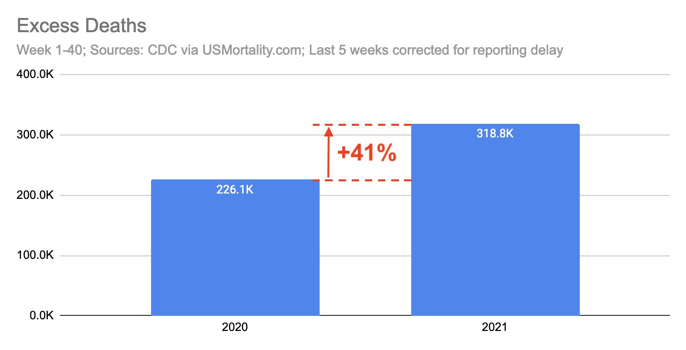 The chart below uses the CDCs numbers for 2020, which we now know to be false. Can the numbers for 2021 be trusted? If they are even remotely accurate, the story is horrific.