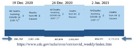 Perhaps the statisticians at CDC saw this oncoming train, because by the end of week 51, 2.9 million deaths had been recorded, averaging 80,000 per week over weeks 47-51, but then came a much more alarming statistical jump that no one seemed to notice. Egregiously and quietly, in the final week of December, CDC added 270,000 deaths, or about five weeks’ worth and something that should have been terrifying headline news if it were true. This mass-casualty event was not even mentioned by the media or public health officials, because it never happened.